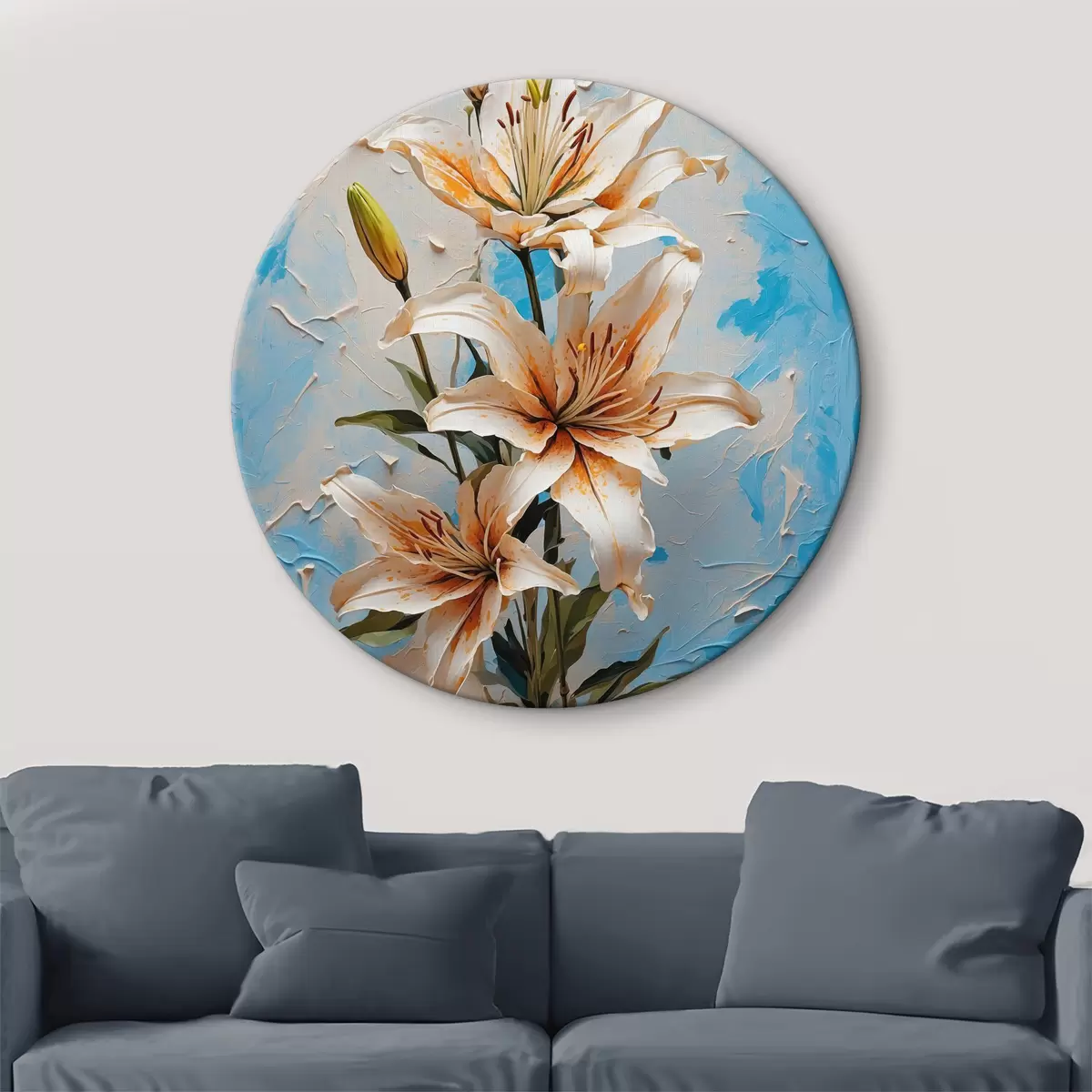 Runde Wandbilder Lilien auf einem abstrakten blauen und weißen Hintergrund Nr r40640