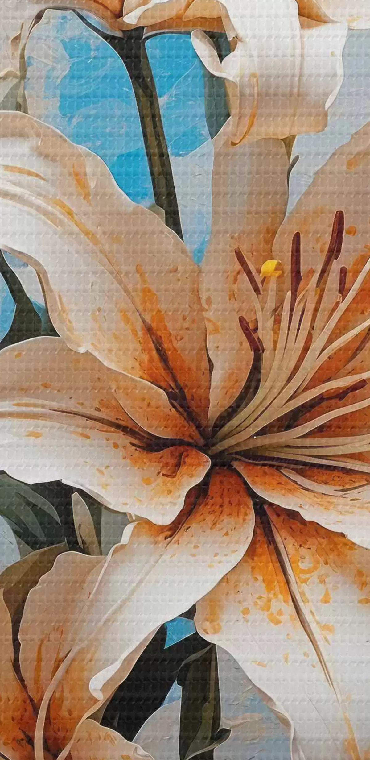 Runde Wandbilder Lilien auf einem abstrakten blauen und weißen Hintergrund r40640