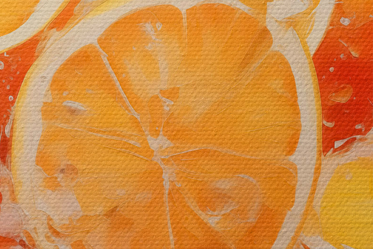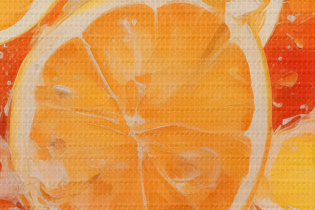 Runde Wandbilder Orangenhälften auf dem Tisch, orange, rot, blau, rosa, gelb r40727