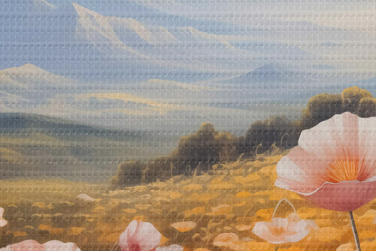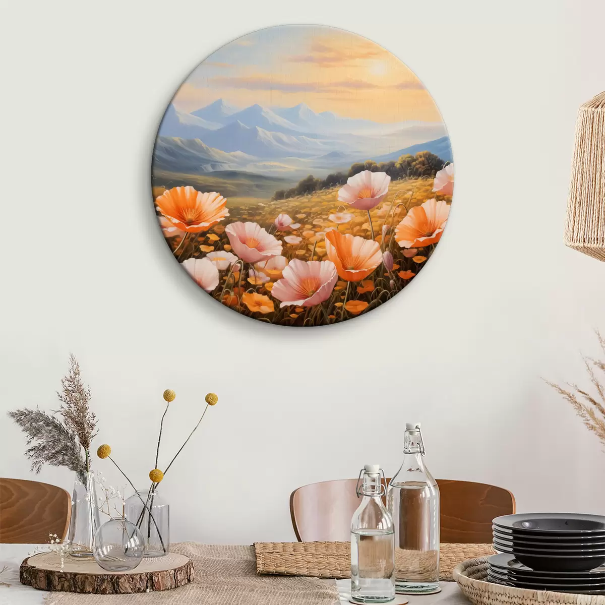 Runde Wandbilder Ein Mohnblumenfeld in der Morgendämmerung mit Bergen im Hintergrund Nr r40730
