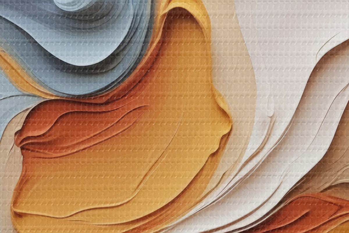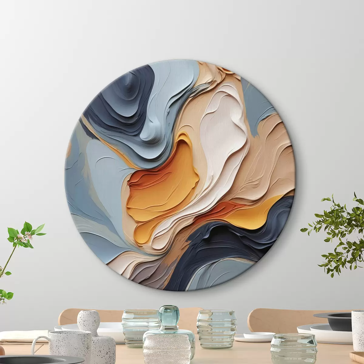 Runde Wandbilder Abstraktion in Blau- und Orangetönen mit Texturimitation r40743