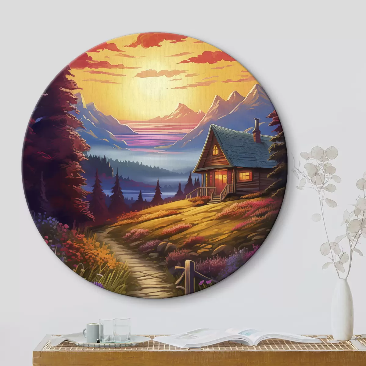 Runde Wandbilder Skurrile Landschaft mit Bergen und Holzhaus Nr r40940