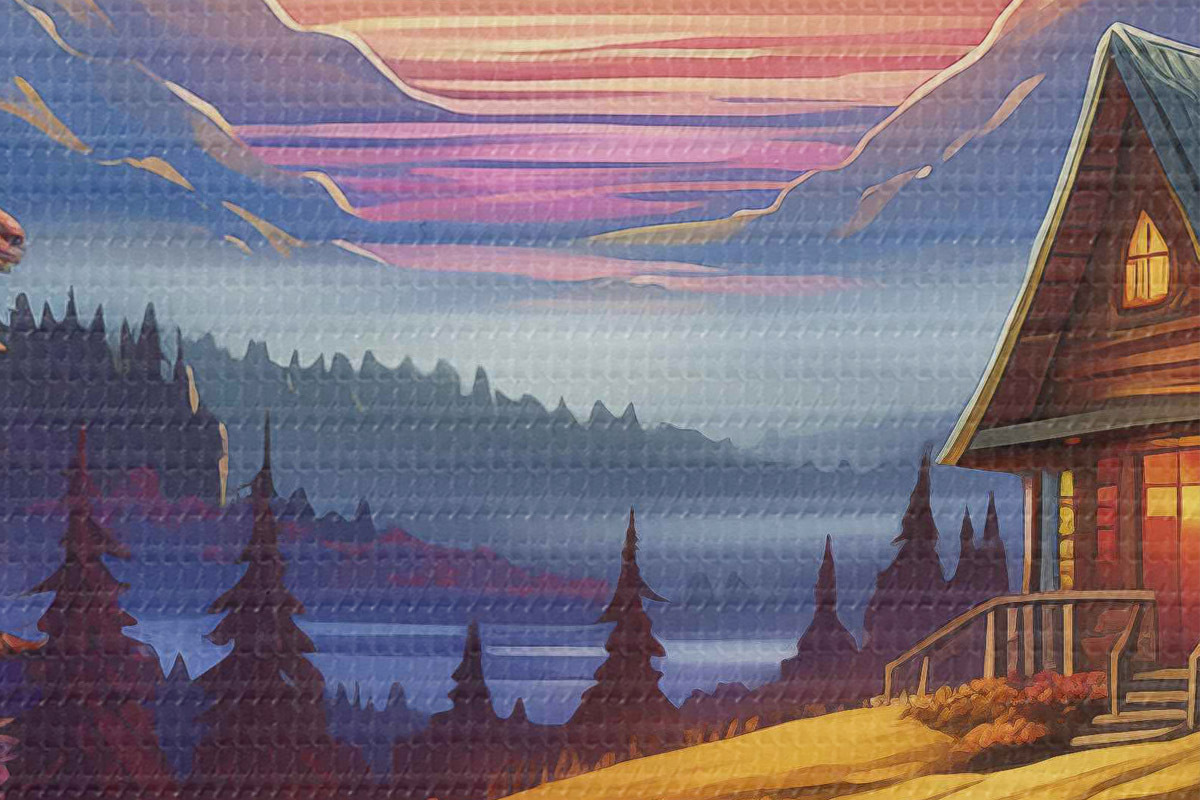 Runde Wandbilder Skurrile Landschaft mit Bergen und Holzhaus Nr r40940