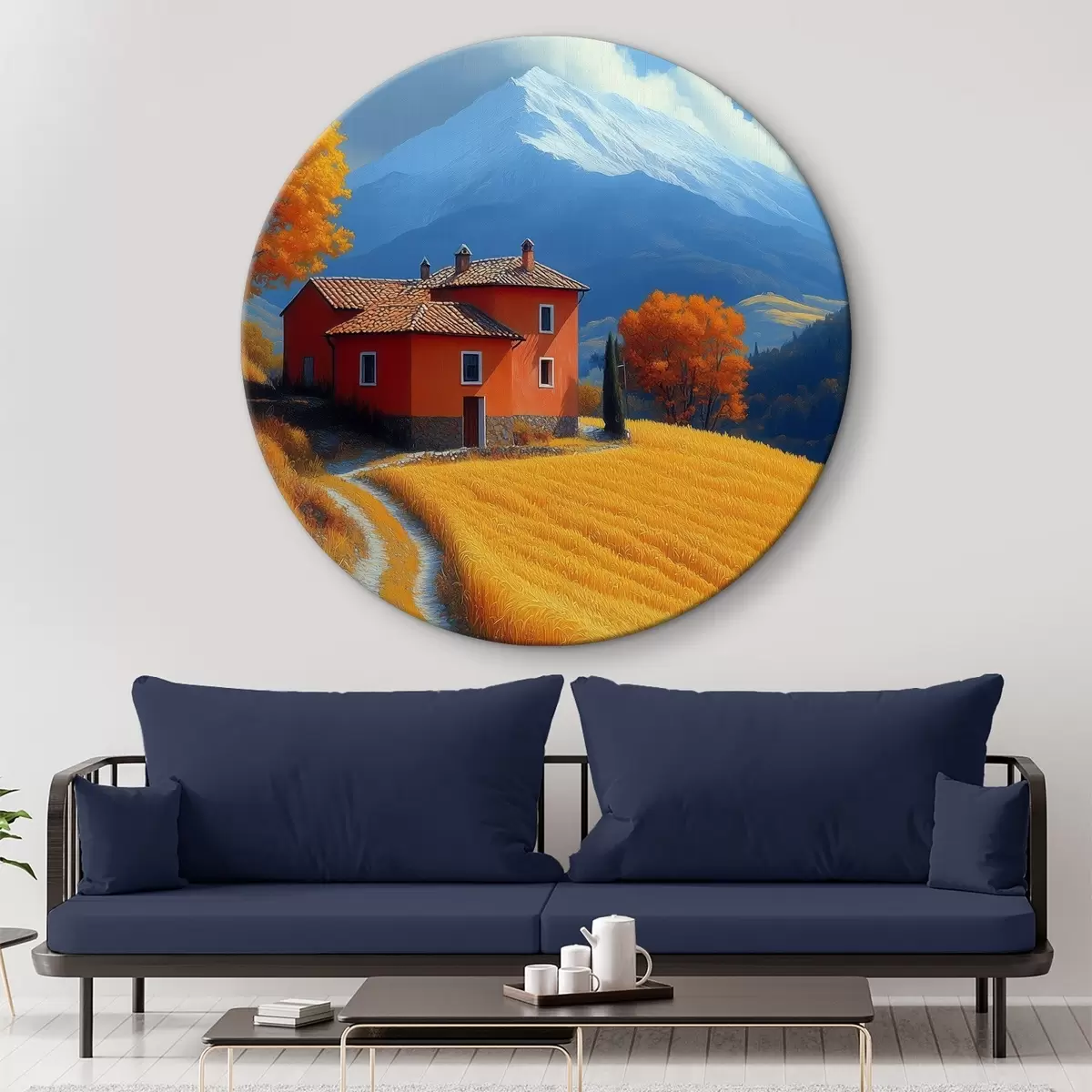 Runde Wandbilder Eine Hütte auf einem Feld mit herbstlichen Bergen im Hintergrund Nr r40962