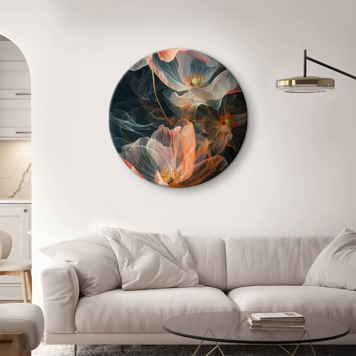 Runde Wandbilder Helle, durchscheinende, in Rauch gehüllte Blumen auf dunklem Hintergrund Nr r40968