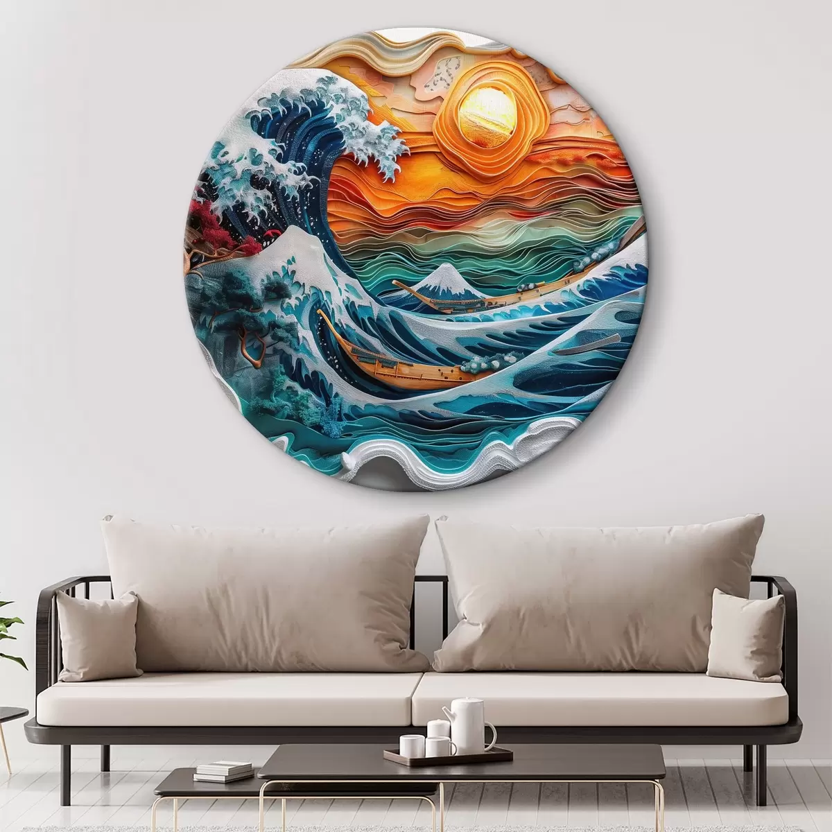 Runde Wandbilder Nachahmung eines Flachreliefs: ein tosendes Meer mit Booten und der Sonne r40976