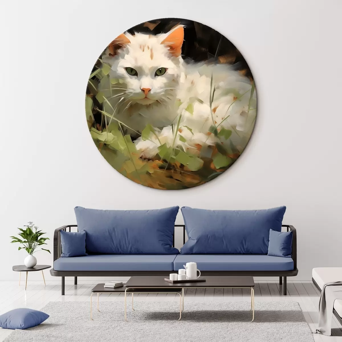 Runde Wandbilder Weiße Katze im Gras liegend, Nachahmung von Pinselstrichen Nr r41017