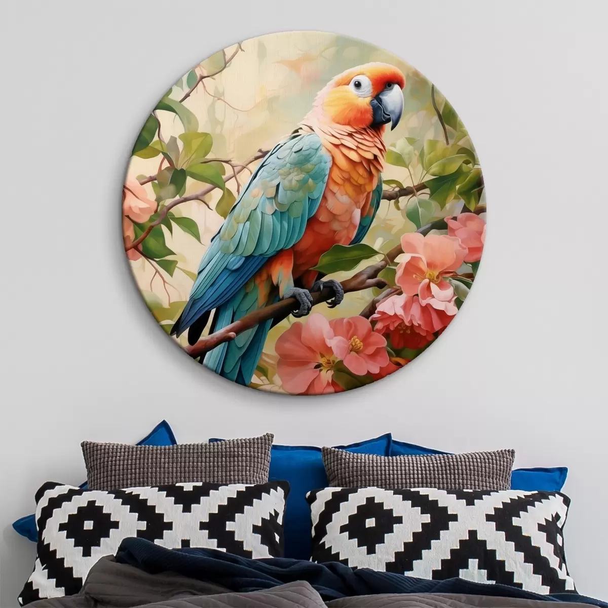 Runde Wandbilder Hänflingspapagei auf einem Zweig mit rosa Blüten sitzend r41018