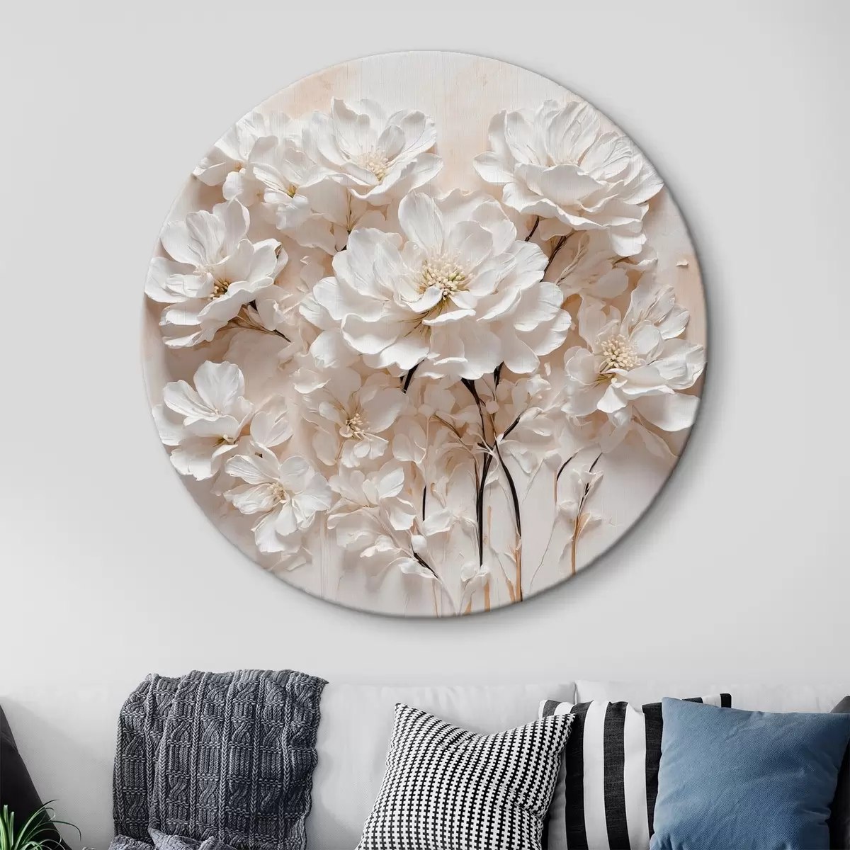 Runde Wandbilder Weiße Blumen auf weißem und orangefarbenem Hintergrund r41042