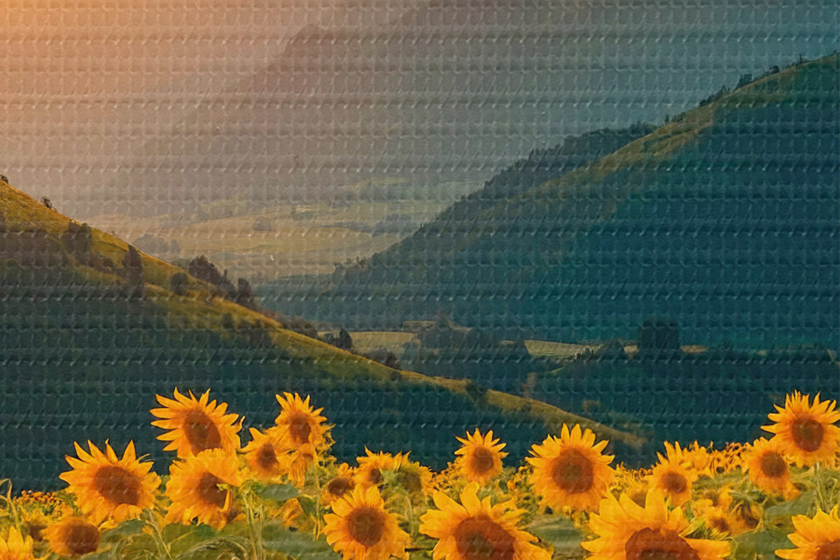 Runde Wandbilder Sonnenblumen vor dem Hintergrund der Berge r41049