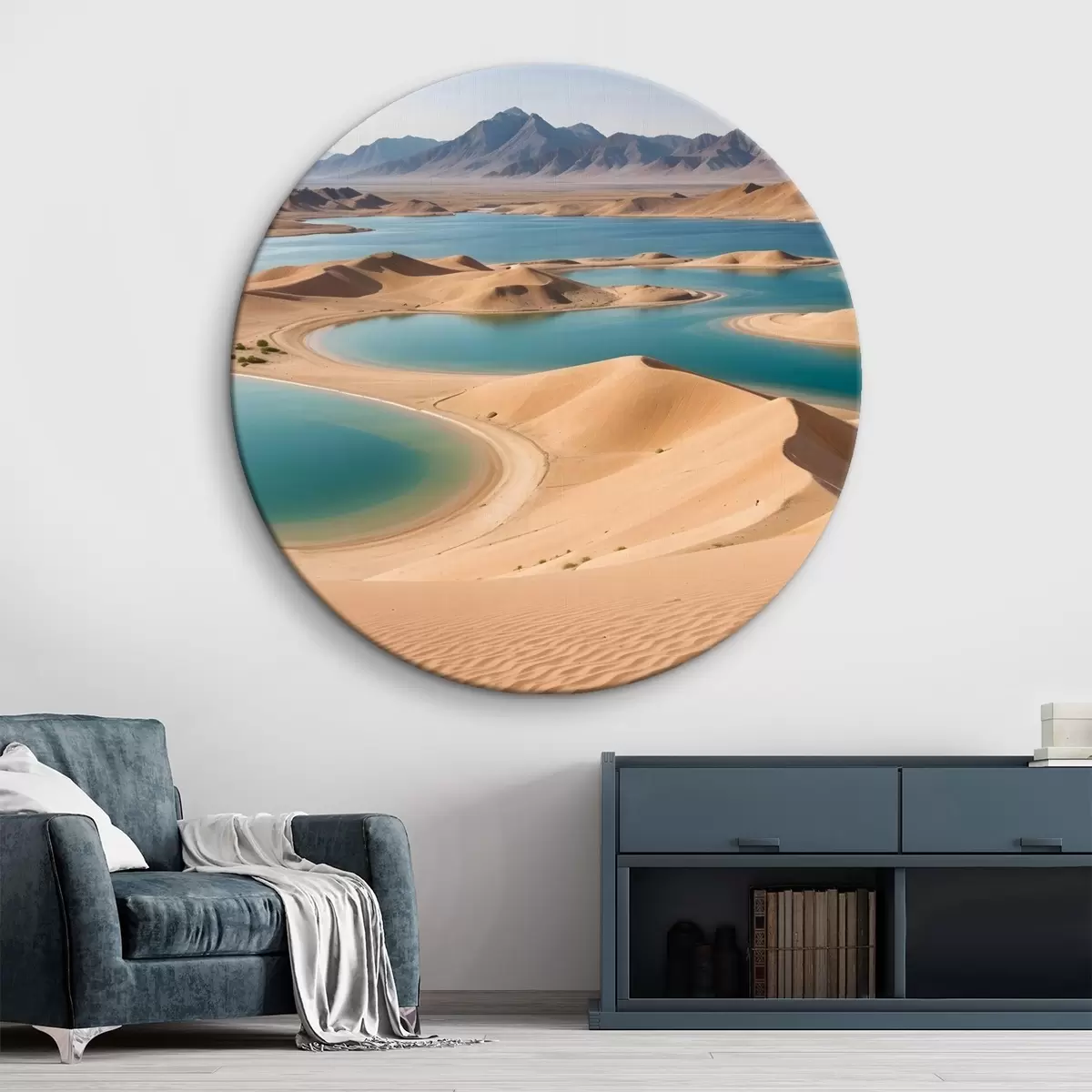 Runde Wandbilder Eine weite Wüstenlandschaft mit sanften Dünen und türkisfarbenen Seen, umgeben von schroffen Bergen Nr r41087
