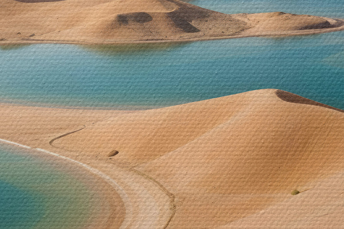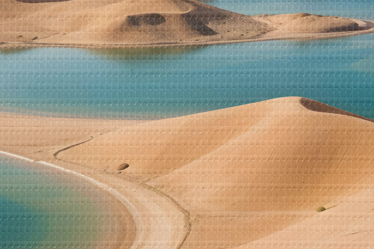 Runde Wandbilder Eine weite Wüstenlandschaft mit sanften Dünen und türkisfarbenen Seen, umgeben von schroffen Bergen r41087