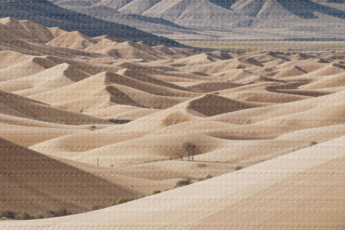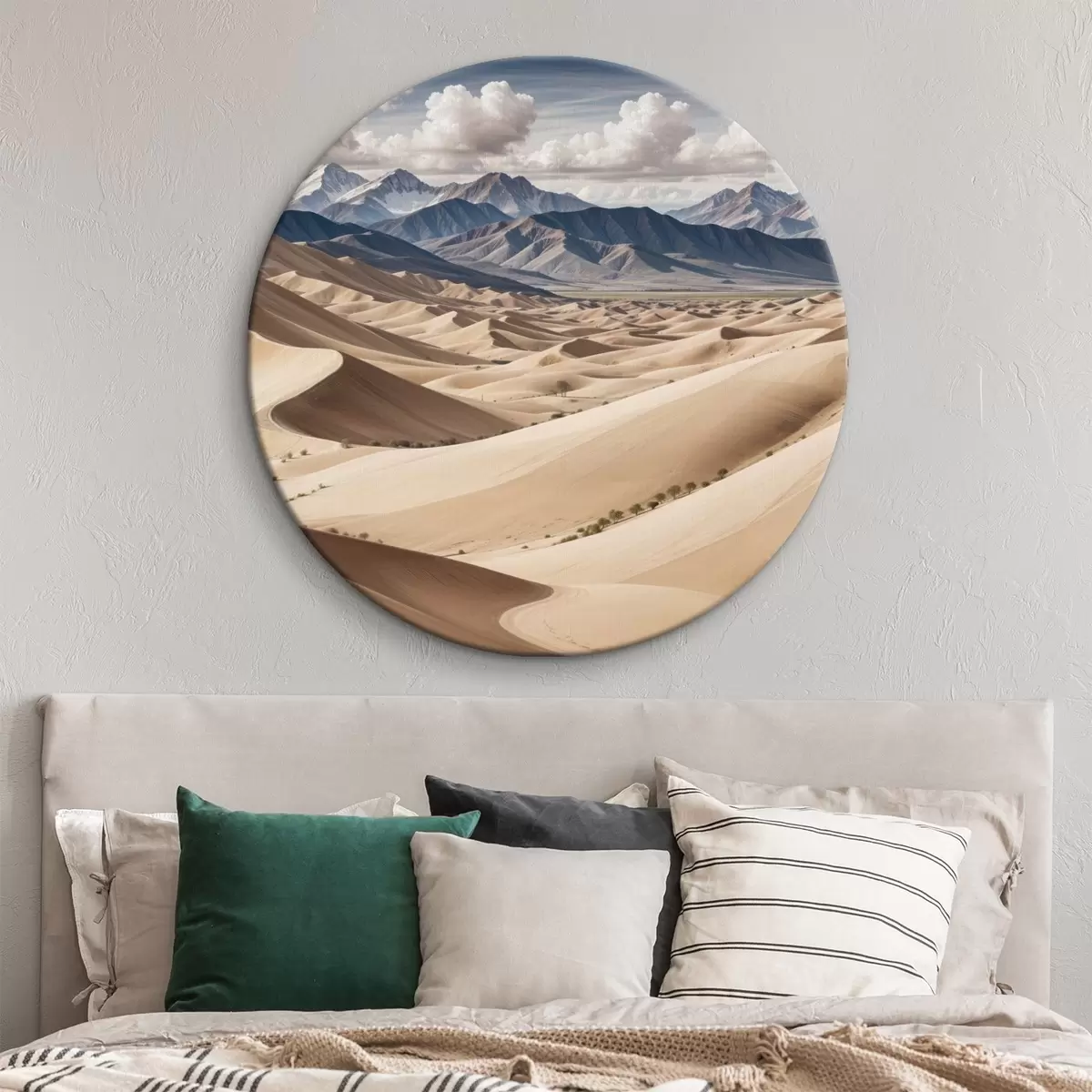 Runde Wandbilder Eine weite Wüstenlandschaft mit sanften Dünen, schroffen Bergen in der Ferne und einem dramatisch bewölkten Himmel Nr r41089