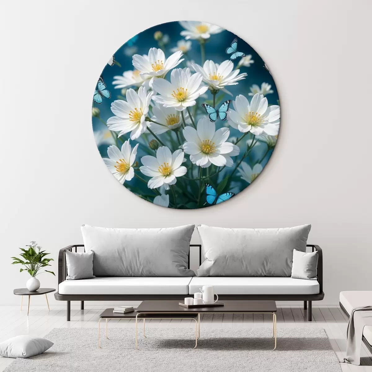 Runde Wandbilder Ein Feld von weißen Gänseblümchen mit blauen Schmetterlingen flattern zwischen ihnen auf einem verschwommenen blauen Hintergrund r41096