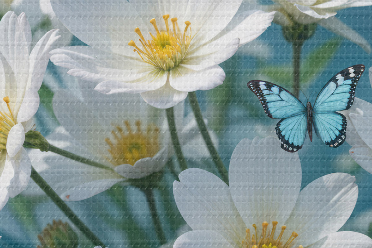 Runde Wandbilder Ein Feld von weißen Gänseblümchen mit blauen Schmetterlingen flattern zwischen ihnen auf einem verschwommenen blauen Hintergrund Nr r41096