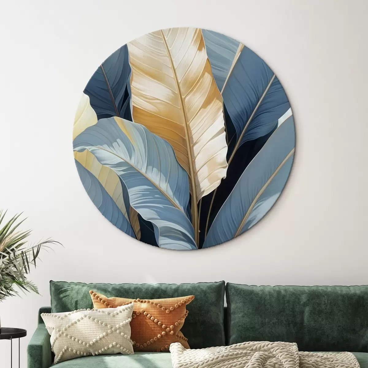 Runde Wandbilder Tropische Blätter mit blauen und gelben Schattierungen, große Palmen- oder Bananenblätter mit üppigem natürlichen Hintergrund r41097