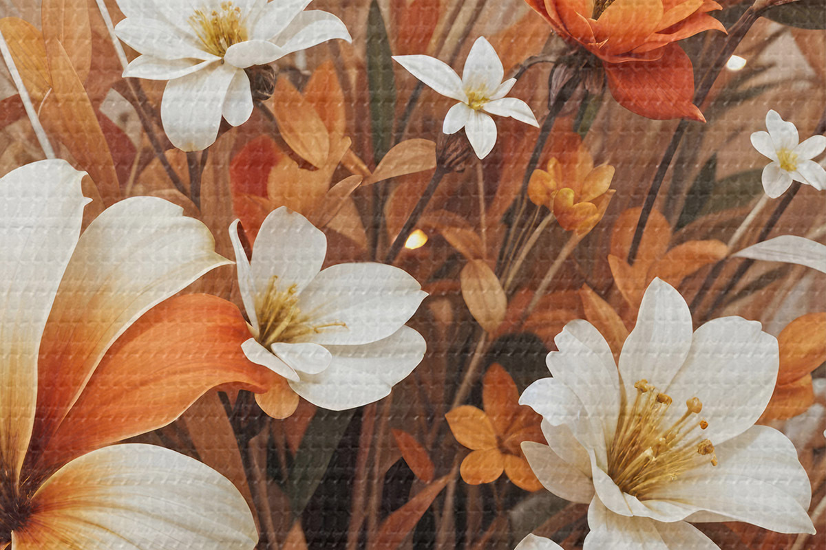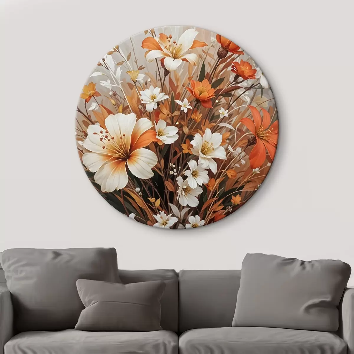 Runde Wandbilder Ein leuchtender Strauß aus orangefarbenen und weißen Blumen, darunter Lilien und andere zarte Blumen r41099