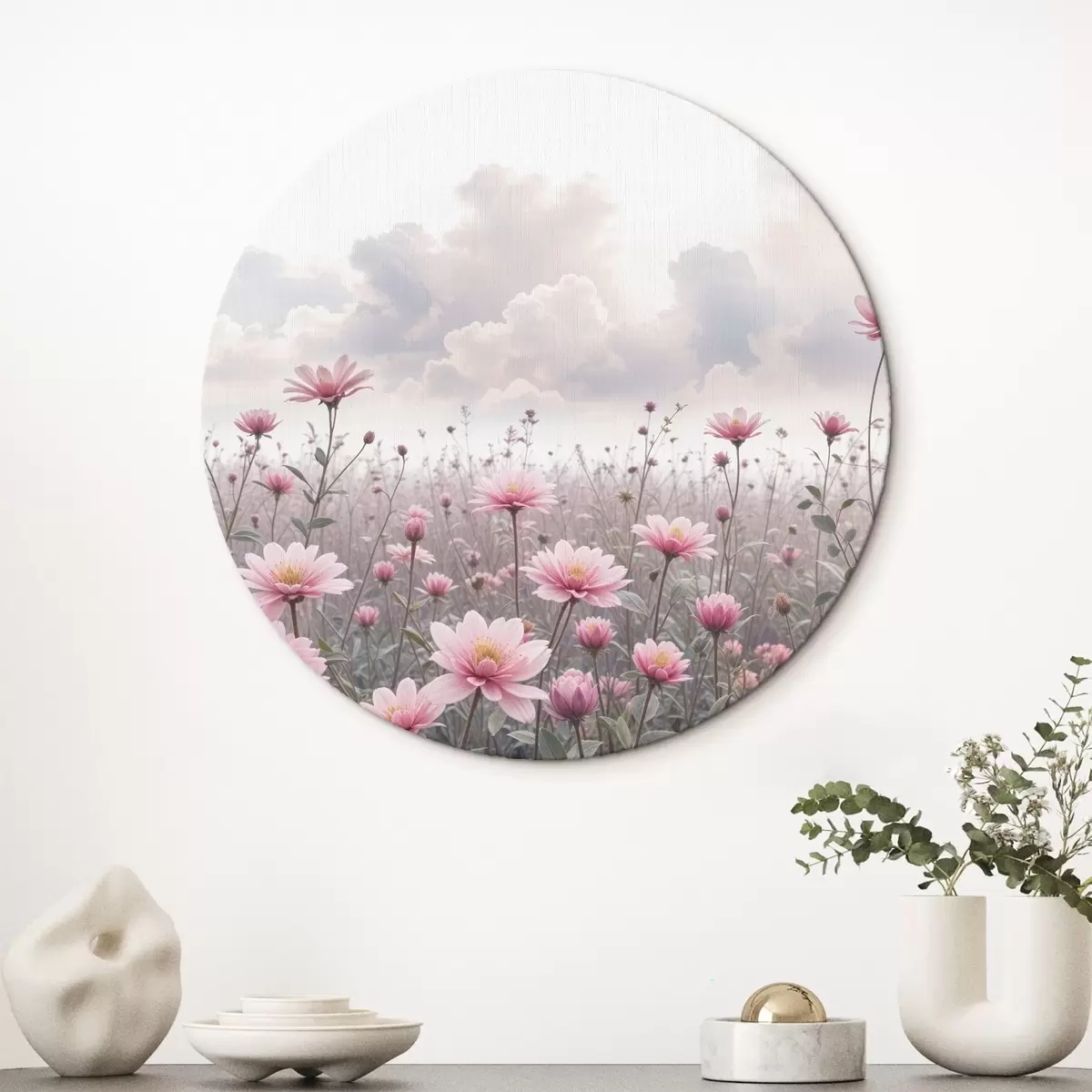Runde Wandbilder Ein Feld mit rosa Gänseblümchen vor einem bewölkten Himmel Nr r41102
