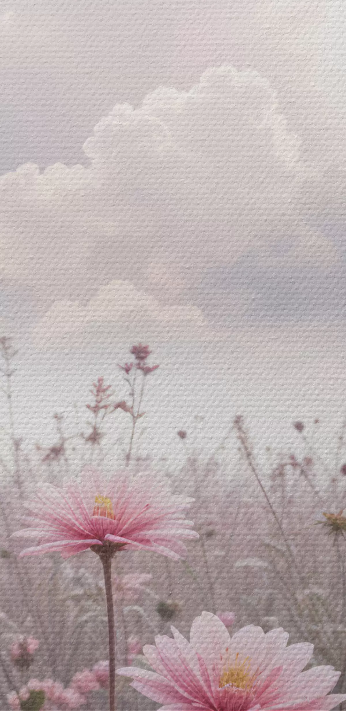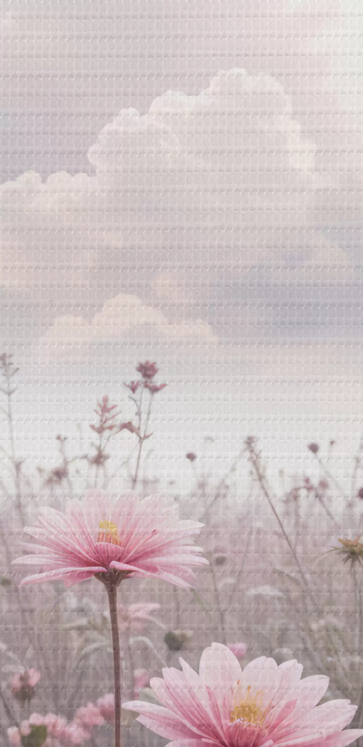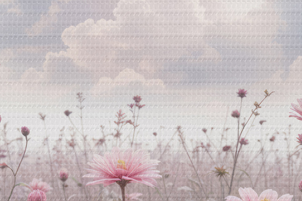 Runde Wandbilder Ein Feld mit rosa Gänseblümchen vor einem bewölkten Himmel r41102