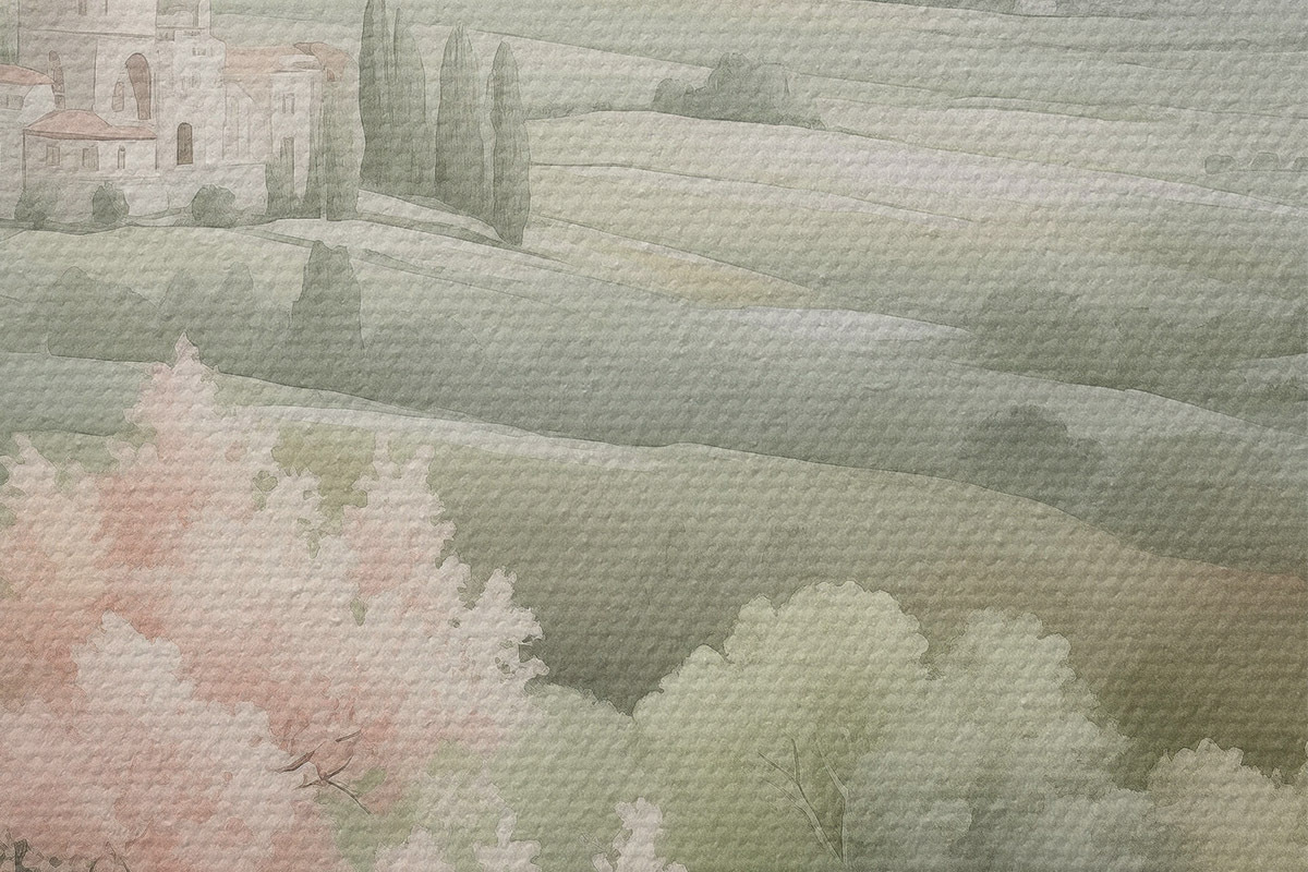 Runde Wandbilder Aquarell Natur, zarte Farben, Rosen, Bäume, grüne Hügel r41223