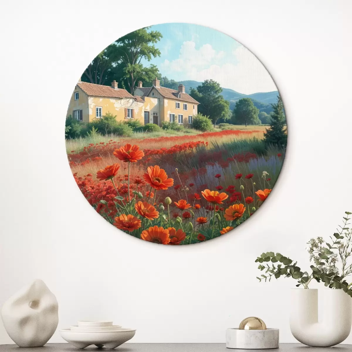 Runde Wandbilder Ein Feld voller leuchtend roter Mohnblumen im Vordergrund, mit einer Reihe reizvoller gelber und weißer Häuser im Hintergrund r41260