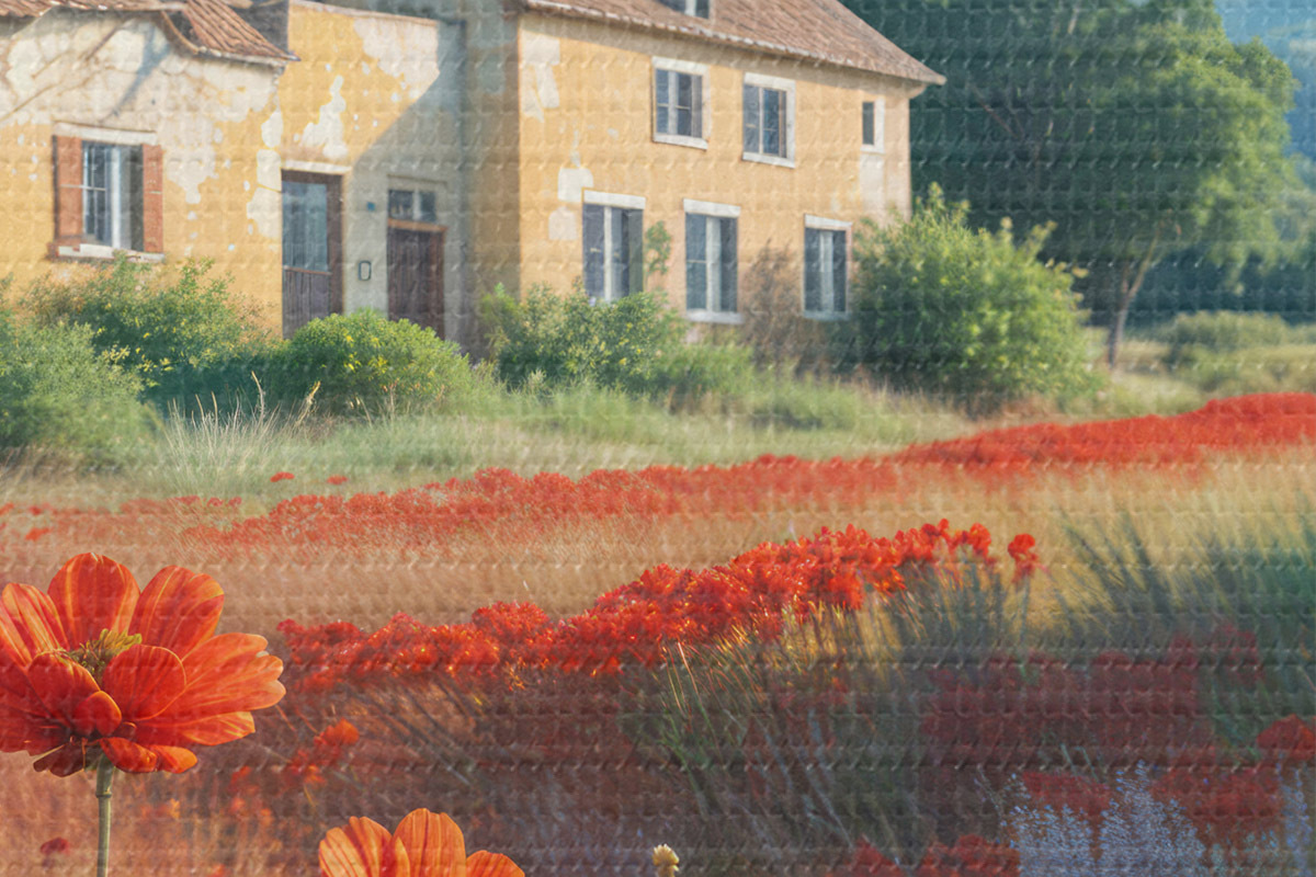Runde Wandbilder Ein Feld voller leuchtend roter Mohnblumen im Vordergrund, mit einer Reihe reizvoller gelber und weißer Häuser im Hintergrund Nr r41260