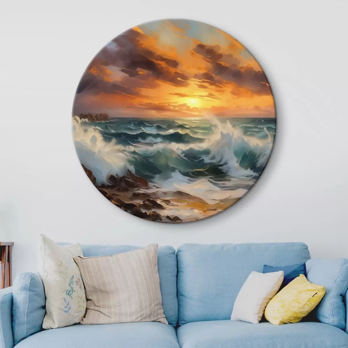 Runde Wandbilder Dramatische Meereslandschaft mit krachenden Wellen und felsigen Klippen, vor einem orange-gelben Himmel mit Wolken Nr r41266