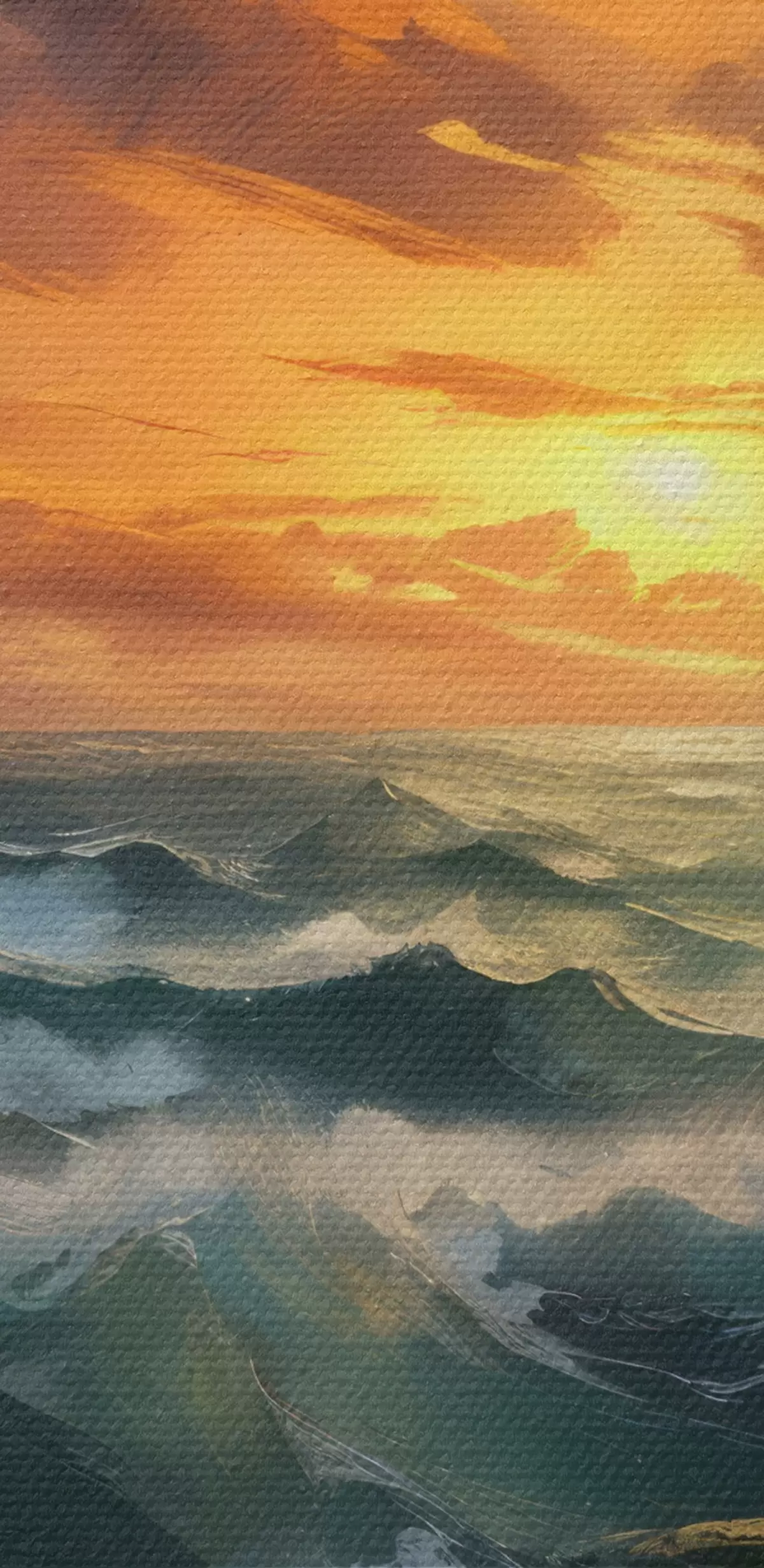 Runde Wandbilder Dramatische Meereslandschaft mit krachenden Wellen und felsigen Klippen, vor einem orange-gelben Himmel mit Wolken r41266