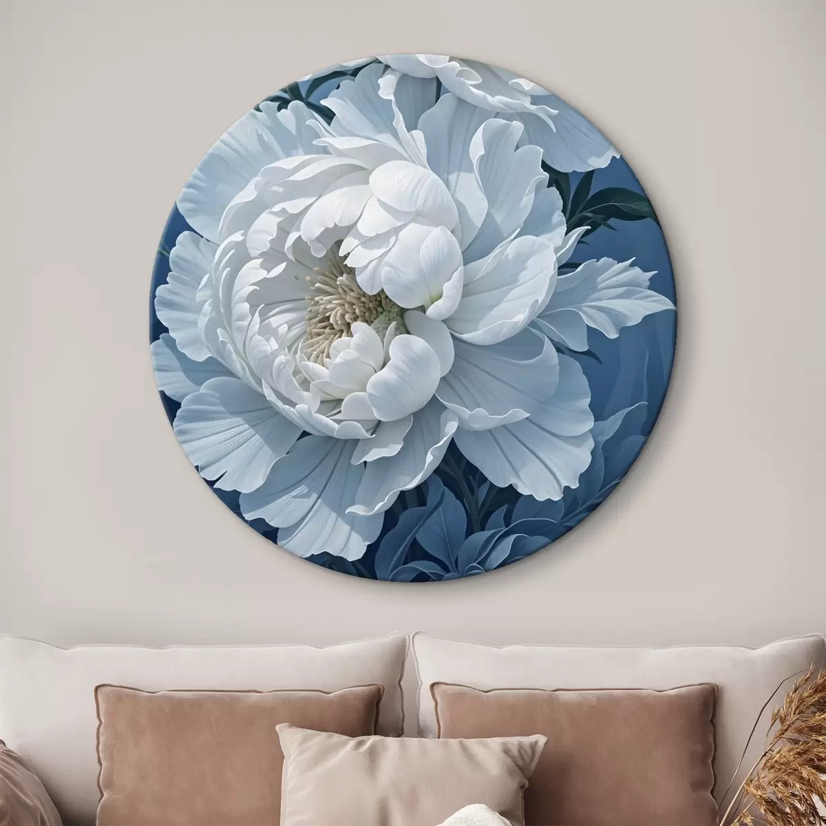 Runde Wandbilder Weiße Pfingstrosen mit grünen Blättern auf dunkelblauem Hintergrund r41270