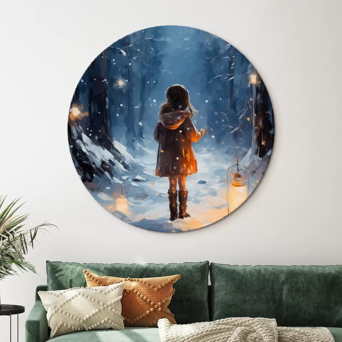 Runde Wandbilder Mädchen im nächtlichen Winterwald zwischen Bäumen und Laternen Nr r41277