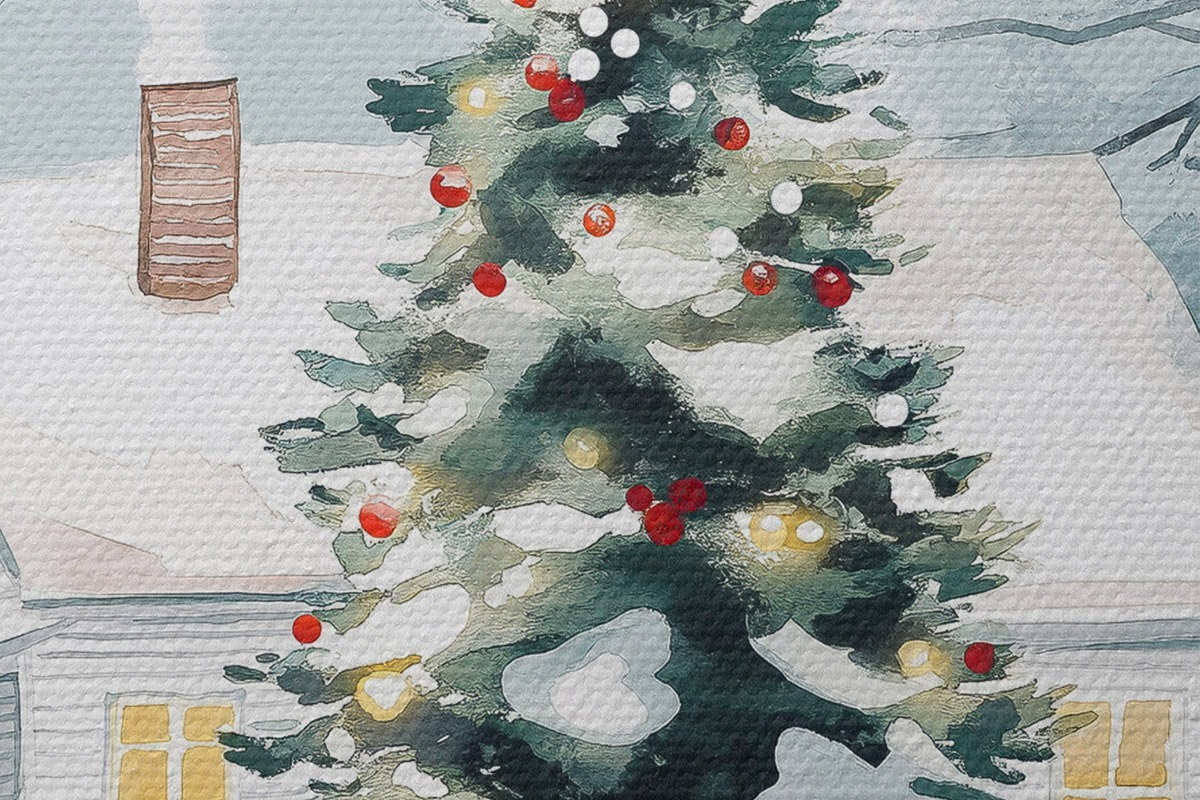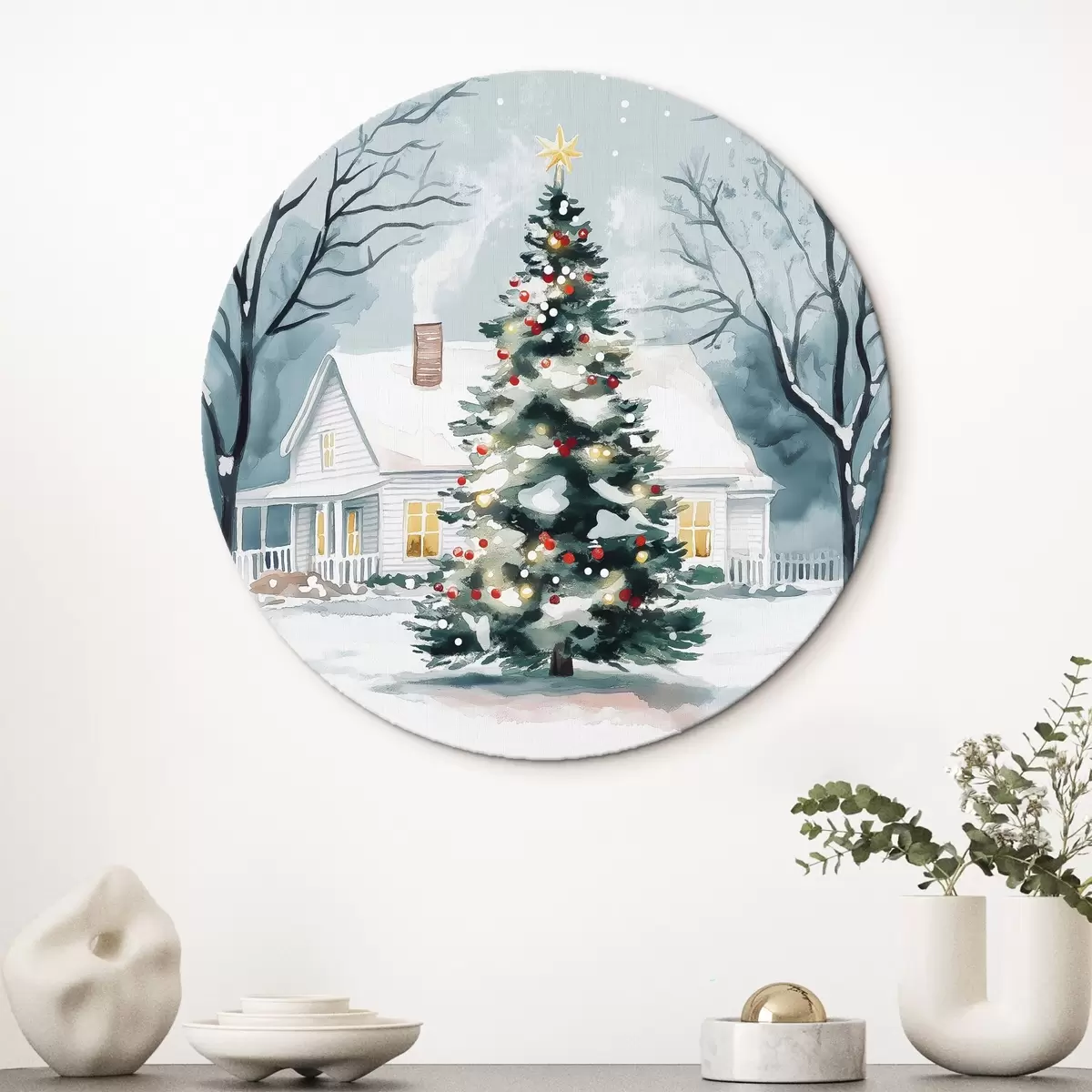 Runde Wandbilder Winterstadt, geschmückter Tannenbaum, Weihnachten, Aquarell r41364