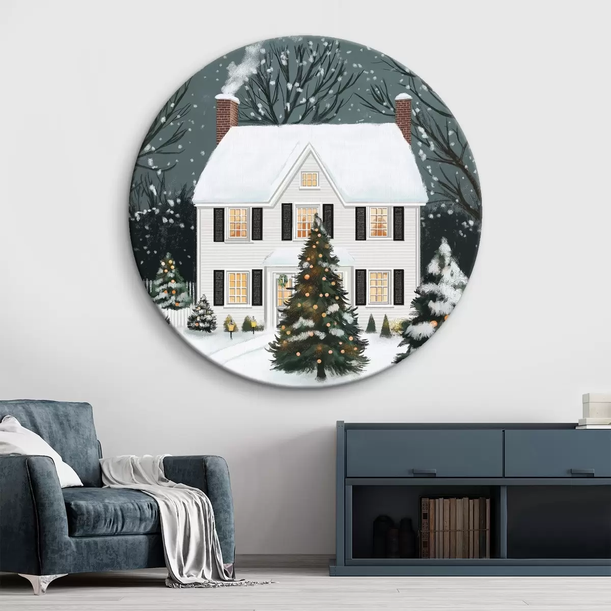 Runde Wandbilder Winterwunderland, Haus, Kiefern, rustikal, Winterlandschaft, Wald Nr r41370