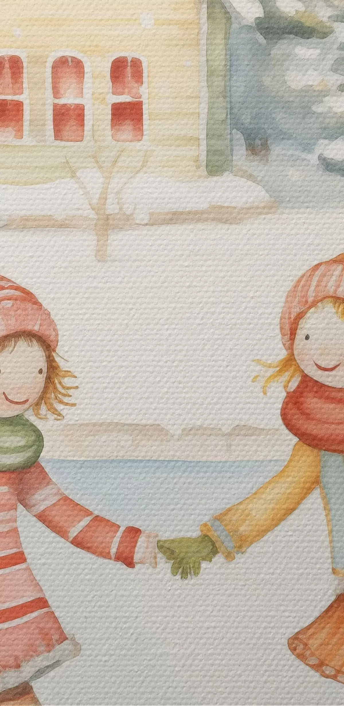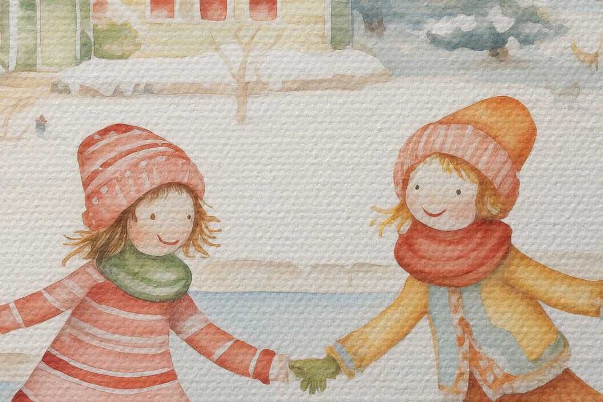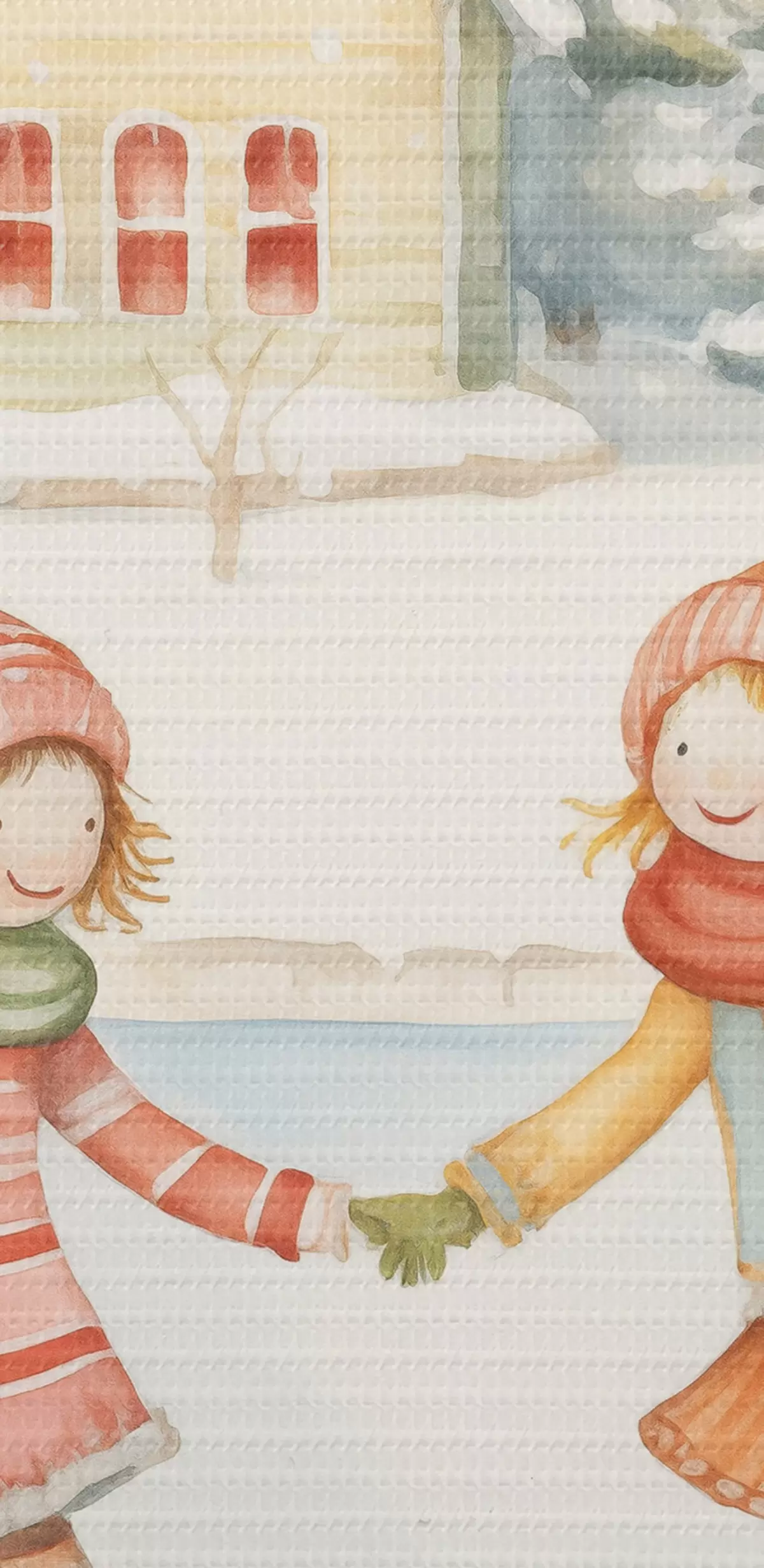 Runde Wandbilder Winterszene mit zwei Mädchen beim Schlittschuhlaufen, Winterstadt, Häuser, Wald r41377