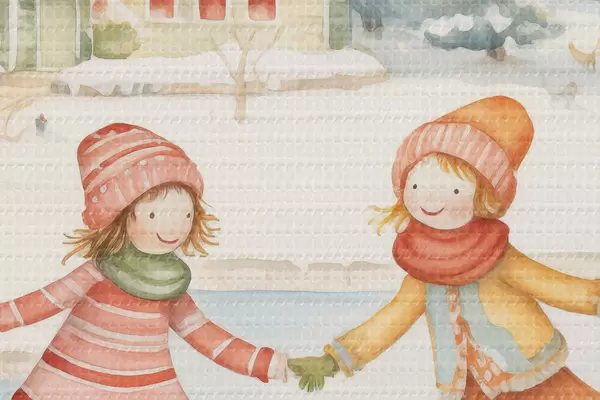 Runde Wandbilder Winterszene mit zwei Mädchen beim Schlittschuhlaufen, Winterstadt, Häuser, Wald r41377
