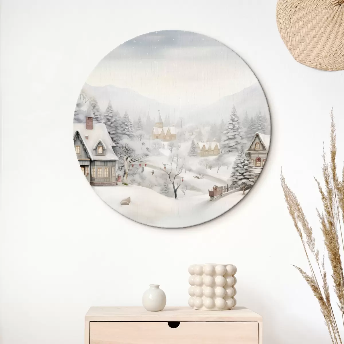 Runde Wandbilder Schöne Winterlandschaft mit Dorf, Kiefern, Häuser, Berge Nr r41384