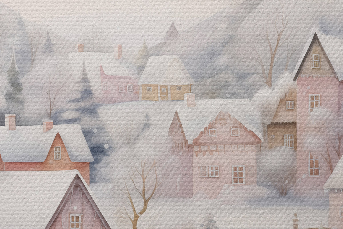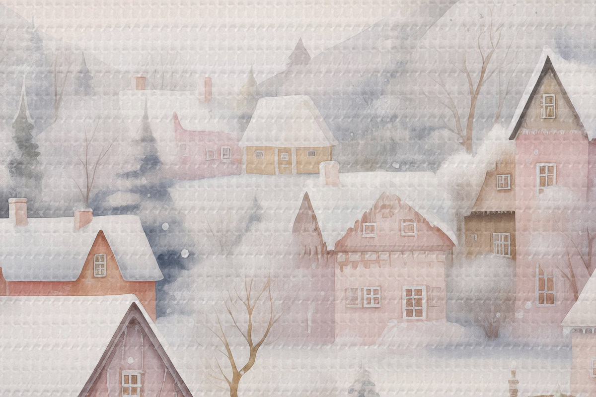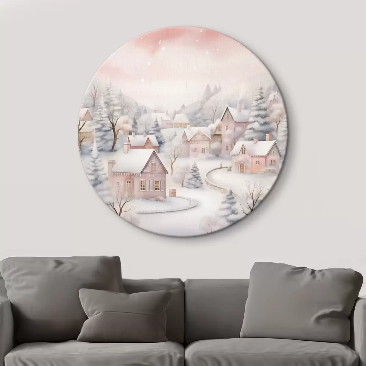 Runde Wandbilder Aquarell Winterdorf, Kiefernwald, Häuser, Berge, weiche Pastellfarben r41388