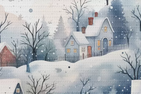 Runde Wandbilder Aquarell Winterlandschaft mit Häusern und Kiefernwald Nr r41389