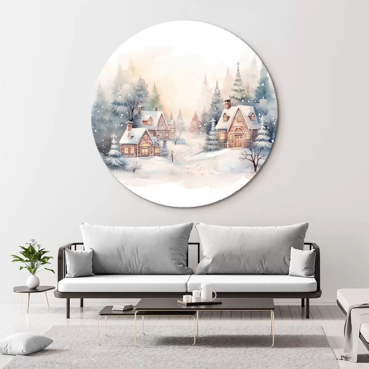 Runde Wandbilder Winterlandschaft, Kiefernwald, schöne Häuser, Aquarell, Susnet r41390