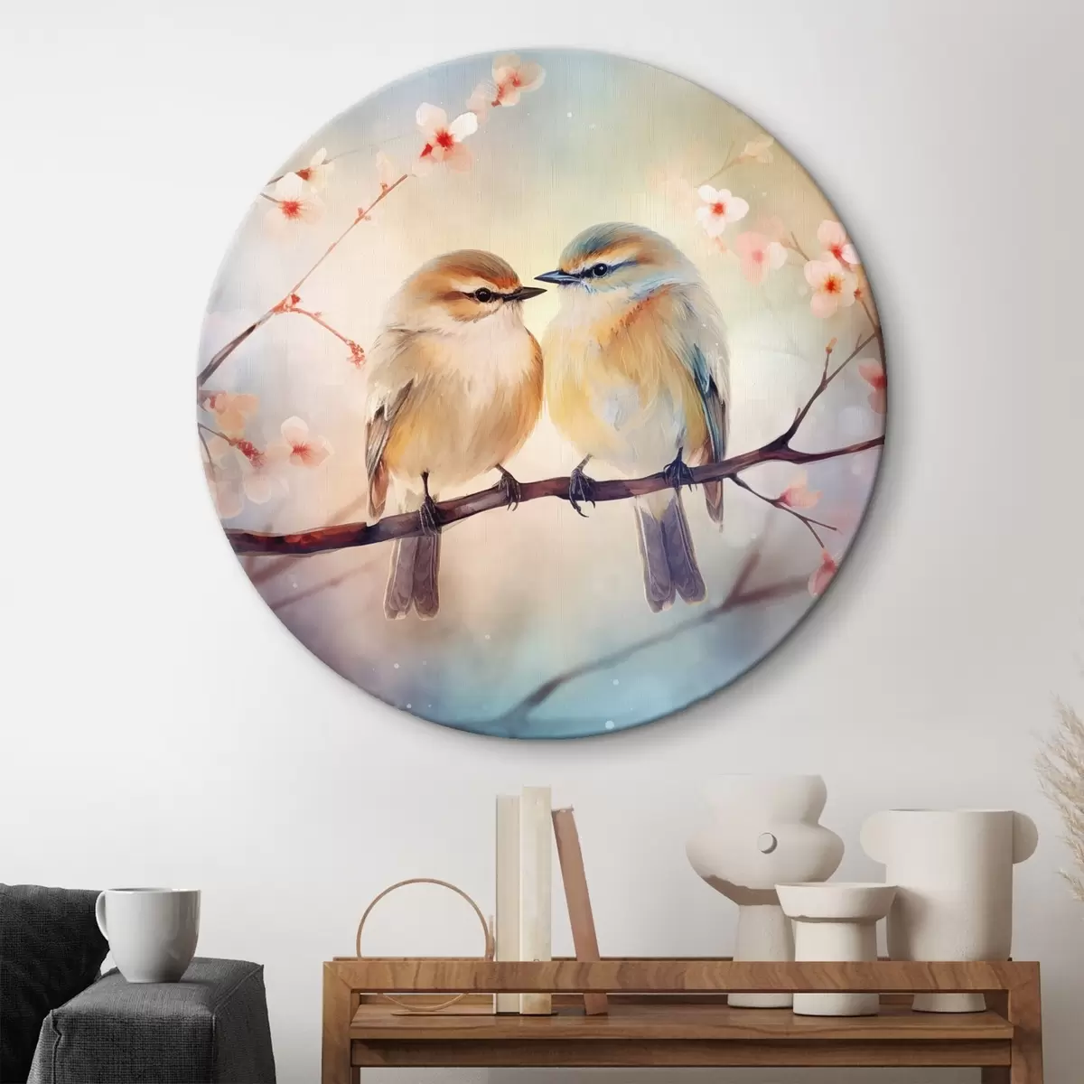 Runde Wandbilder Ein Vogelpaar sitzt auf einem blühenden Zweig r41476