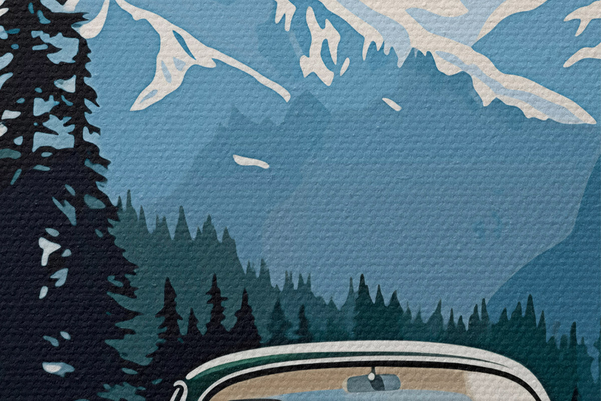 Runde Wandbilder Retro-Auto auf einer winterlichen Bergstraße r41478