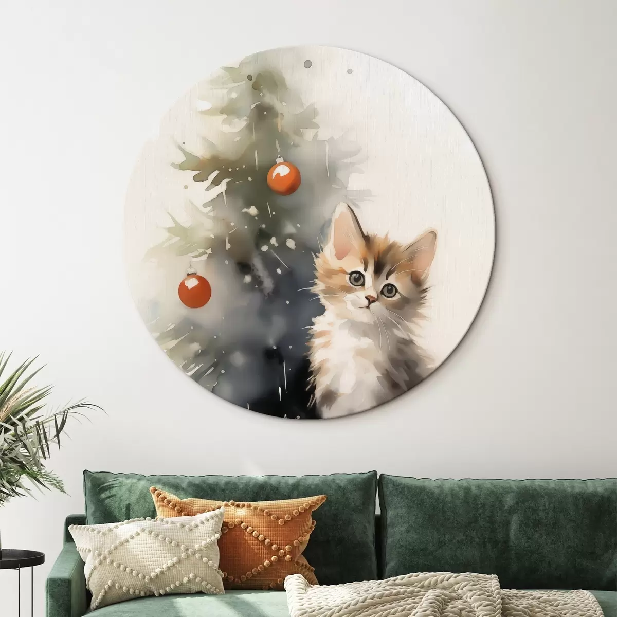 Runde Wandbilder Kätzchen in der Nähe des Weihnachtsbaums Nachahmung des nassen Aquarells r42140