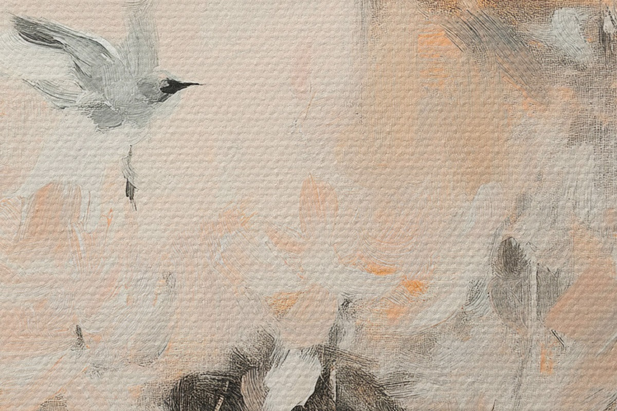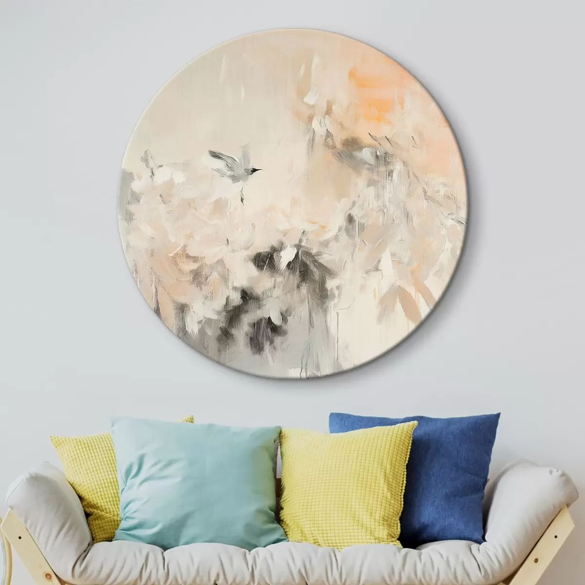 Runde Wandbilder Abstraktion mit fliegenden Vögeln, Acryl-Stil, rosa und beige Farben r42205