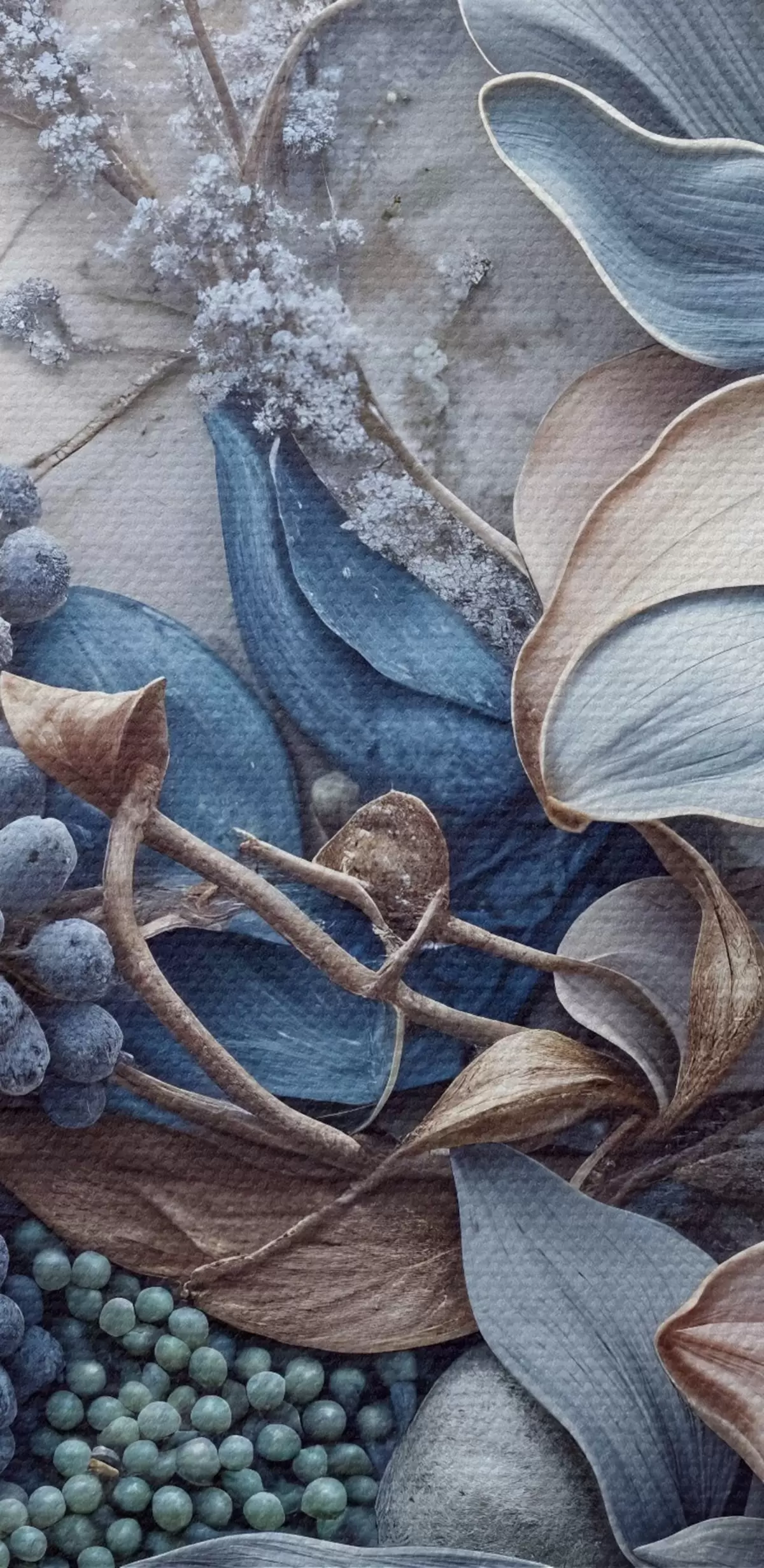 Runde Wandbilder Detaillierte, strukturierte, abstrakte, üppige Blumen mit großen, leuchtend blauen und rosa Blumen, Beeren und anderen botanischen Elementen Nr r42210