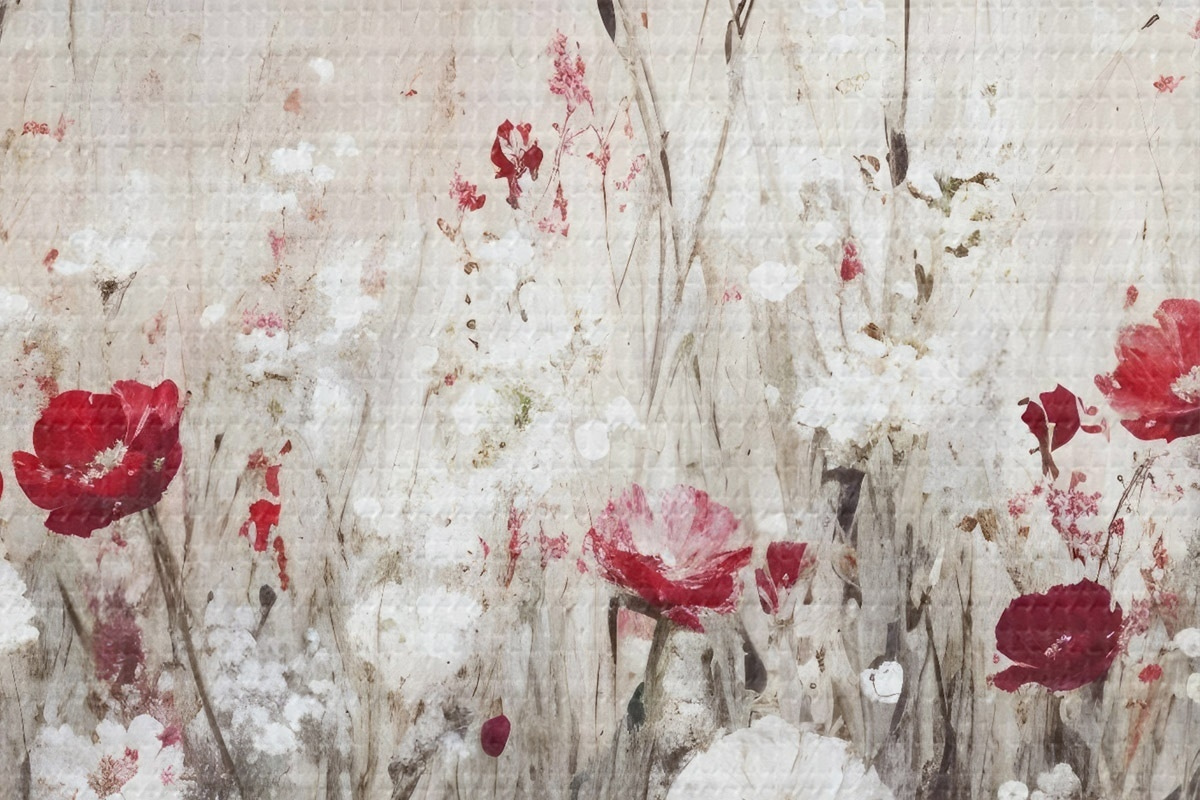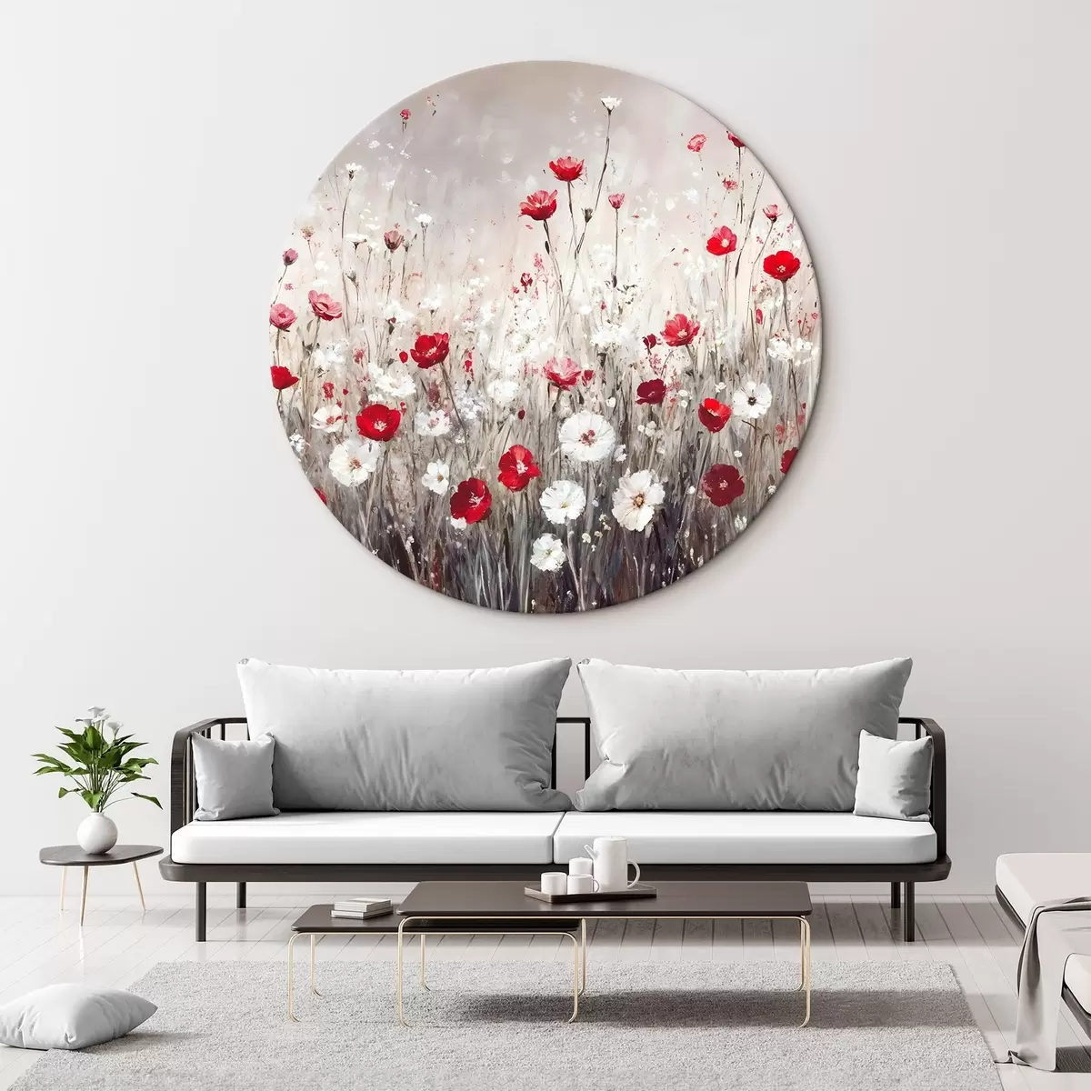 Runde Wandbilder Abstrakte Nachahmung der Ölmalerei ein Feld von roten und weißen Mohnblumen und Gänseblümchen vor einem grauen strukturierten Hintergrund r42213