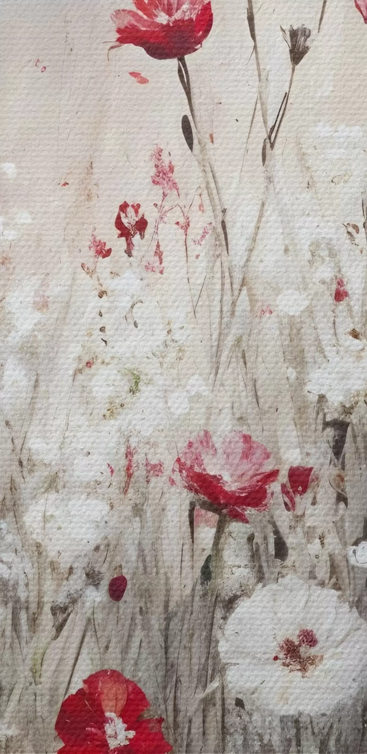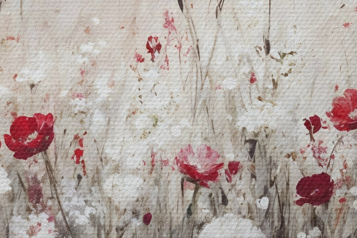 Runde Wandbilder Abstrakte Nachahmung der Ölmalerei ein Feld von roten und weißen Mohnblumen und Gänseblümchen vor einem grauen strukturierten Hintergrund Nr r42213