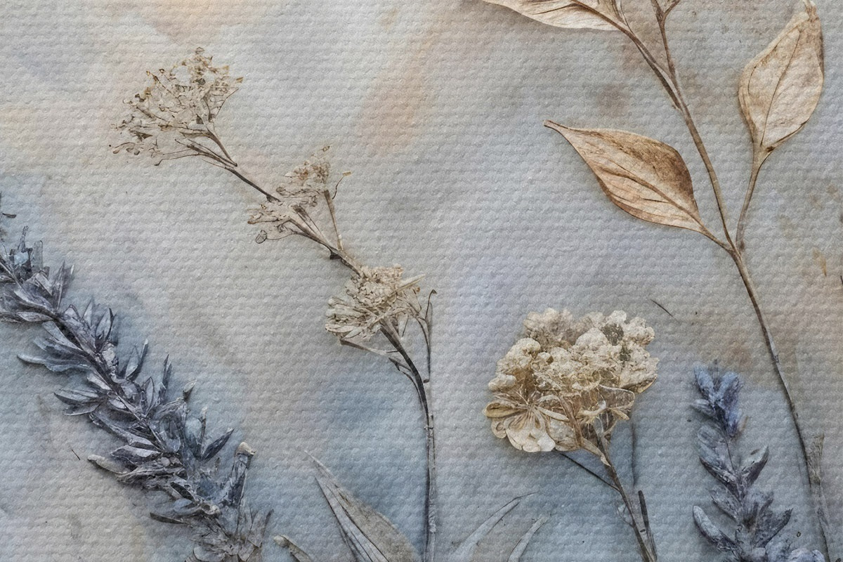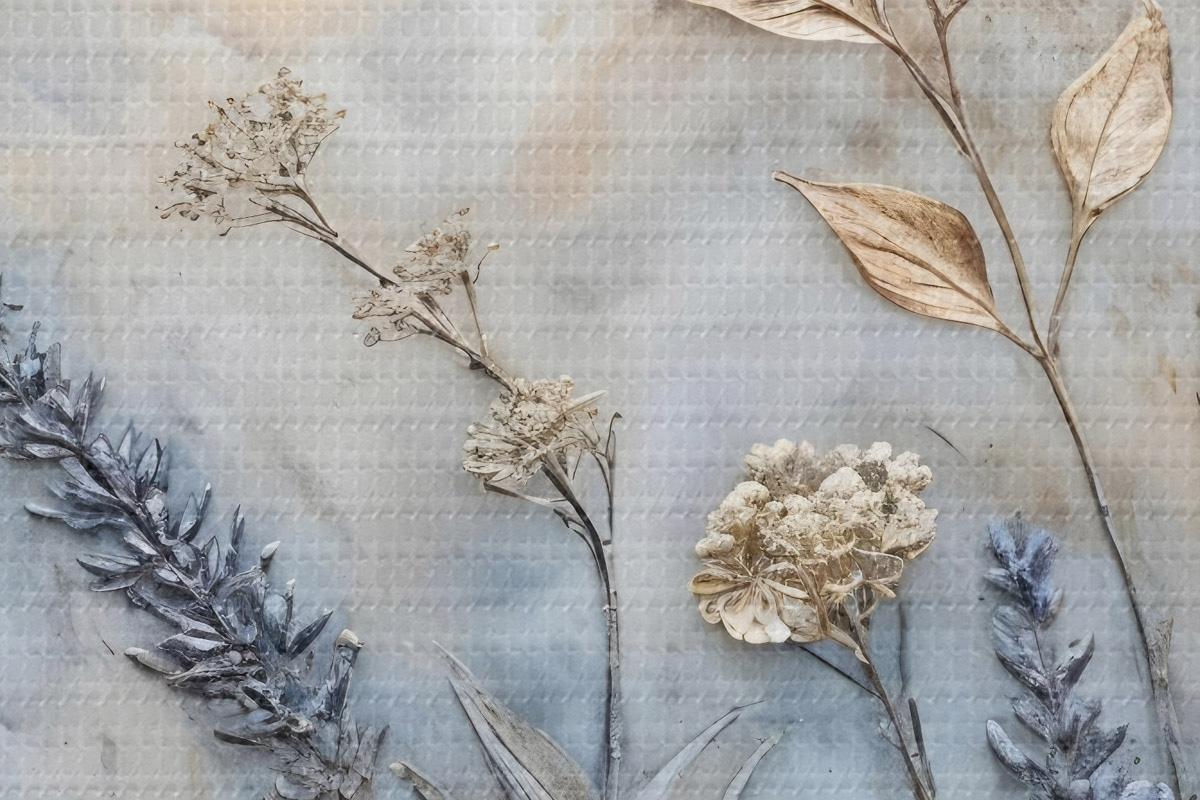 Runde Wandbilder Ein Feld mit verschiedenen Wildblumen und Pflanzen in Blau-, Weiß- und Beigetönen vor einem weichen, dunstigen Hintergrund r42214