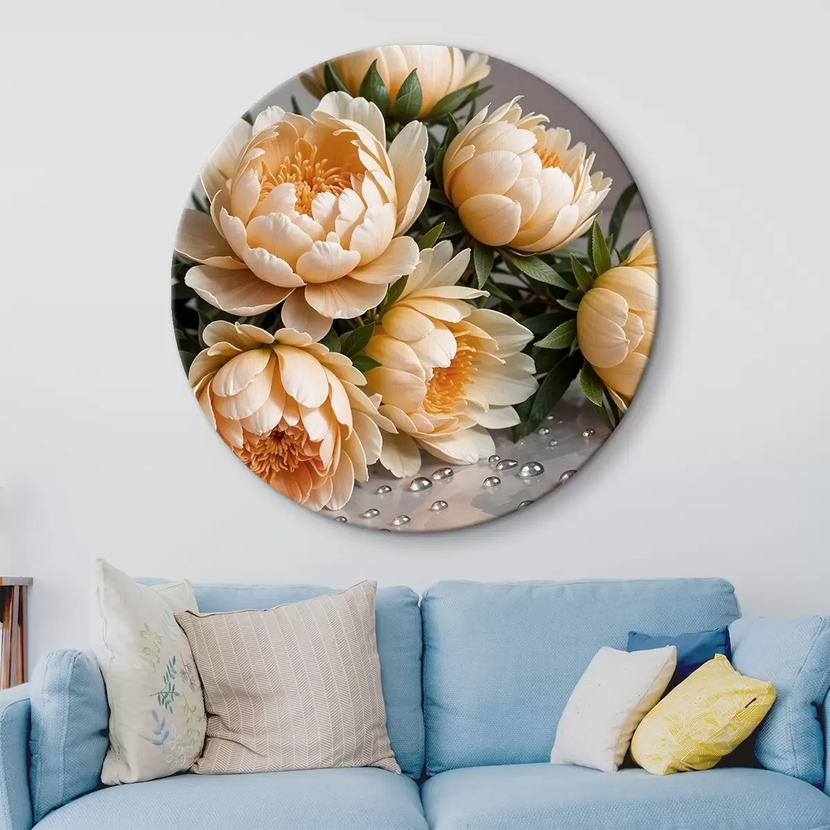 Runde Wandbilder Cremefarbene detaillierte Pfingstrose Blumen mit dunkelgrünen Blättern auf einem grauen Hintergrund Nr r42215