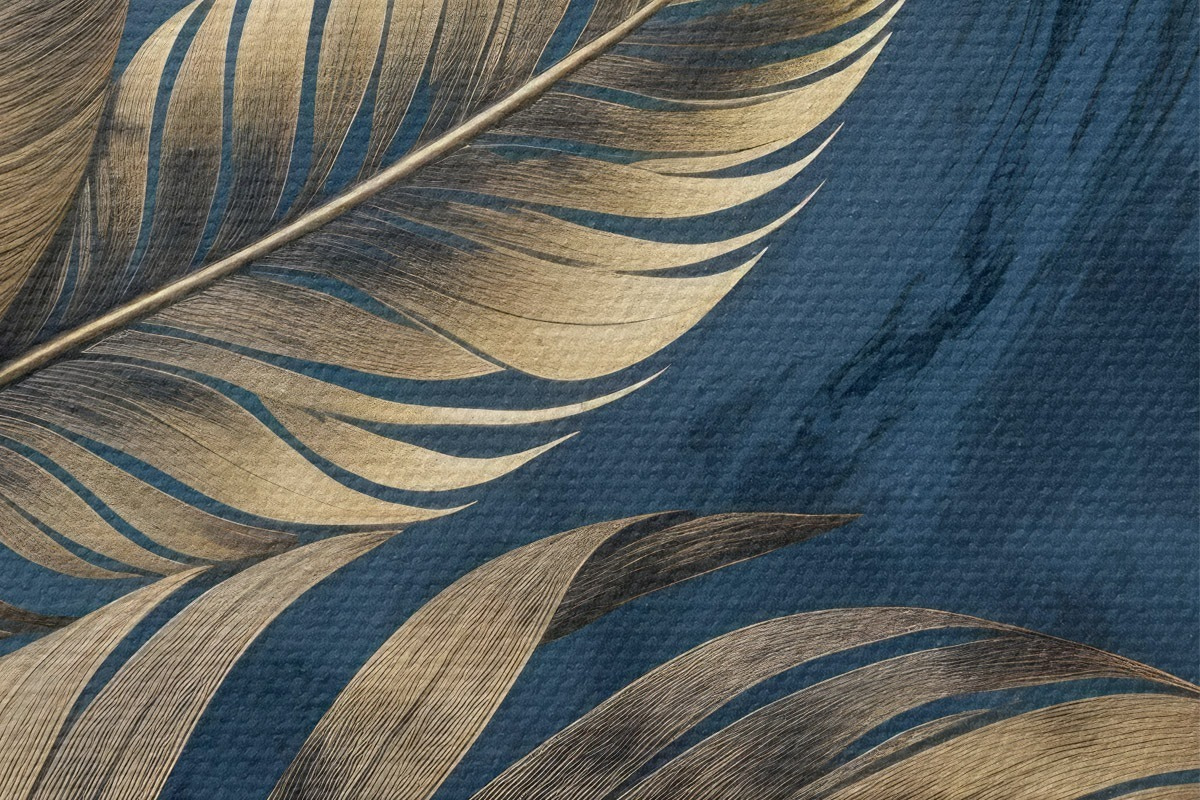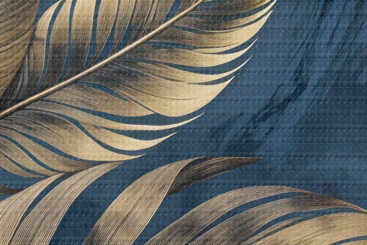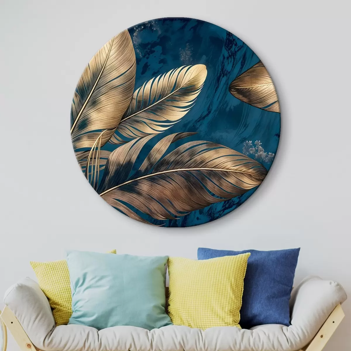 Runde Wandbilder Gelbe und beigefarbene abstrakte dekorative Federn, die auf einem dunkelblauen strukturierten Hintergrund schweben r42218