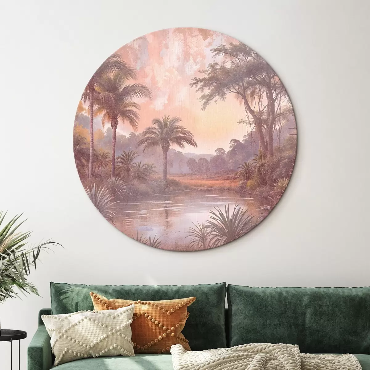 Runde Wandbilder Eine tropisch strukturierte Landschaft mit einem ruhigen See, umgeben von üppigen Palmen und anderem Laub Nr r42219