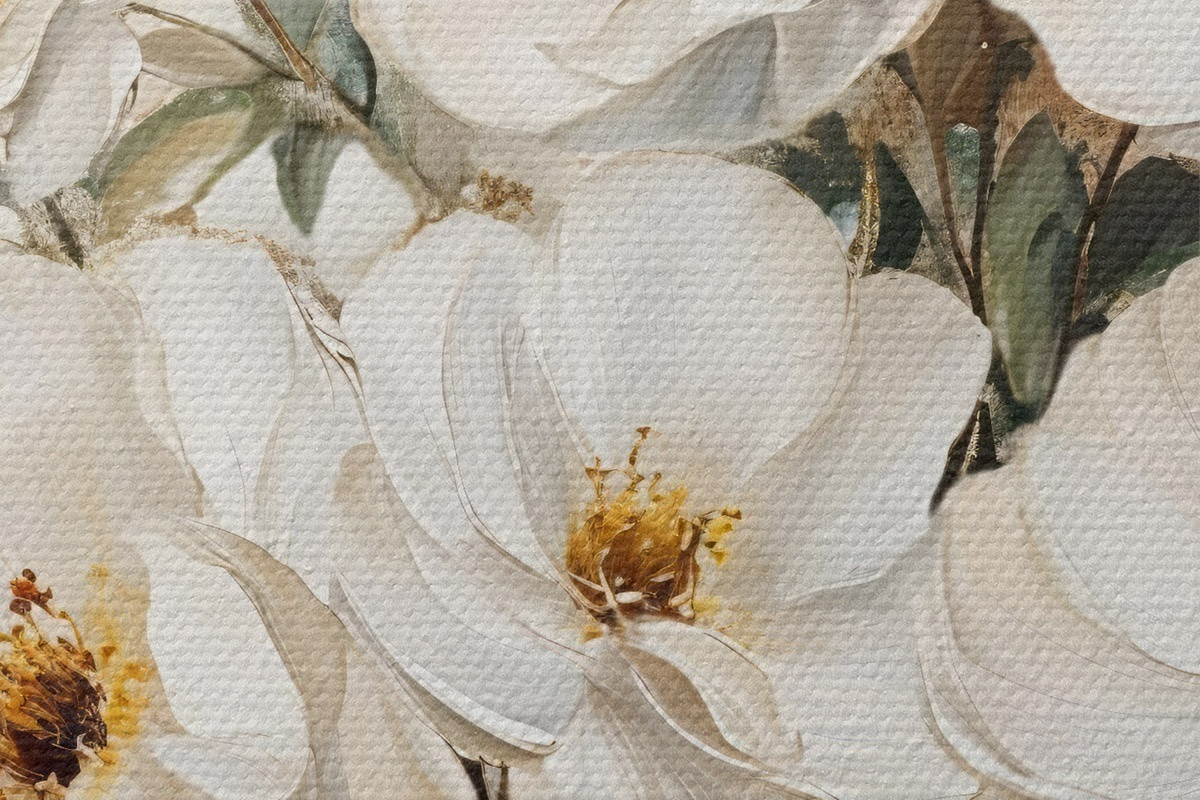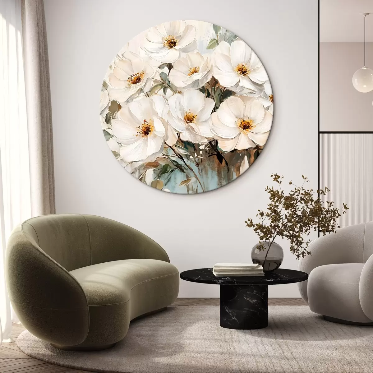 Runde Wandbilder Ein Strauß großer weißer Blumen in Ölmalerei Stil mit gelben Zentren vor einem hellen Hintergrund r42222